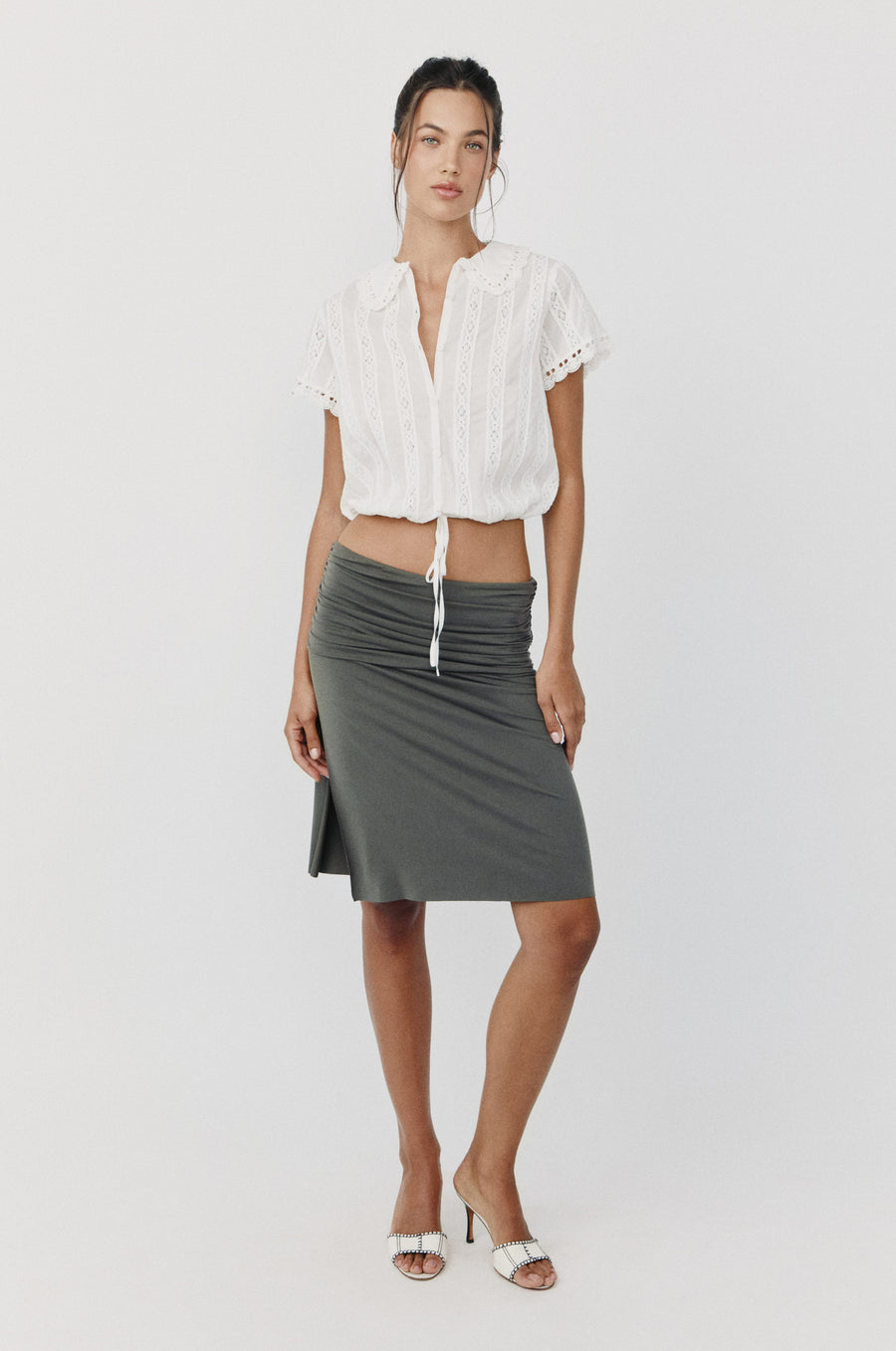 The Lila Skirt is a low-rise, midi-length skirt featuring a side slit and ruched detailing on the waistband.