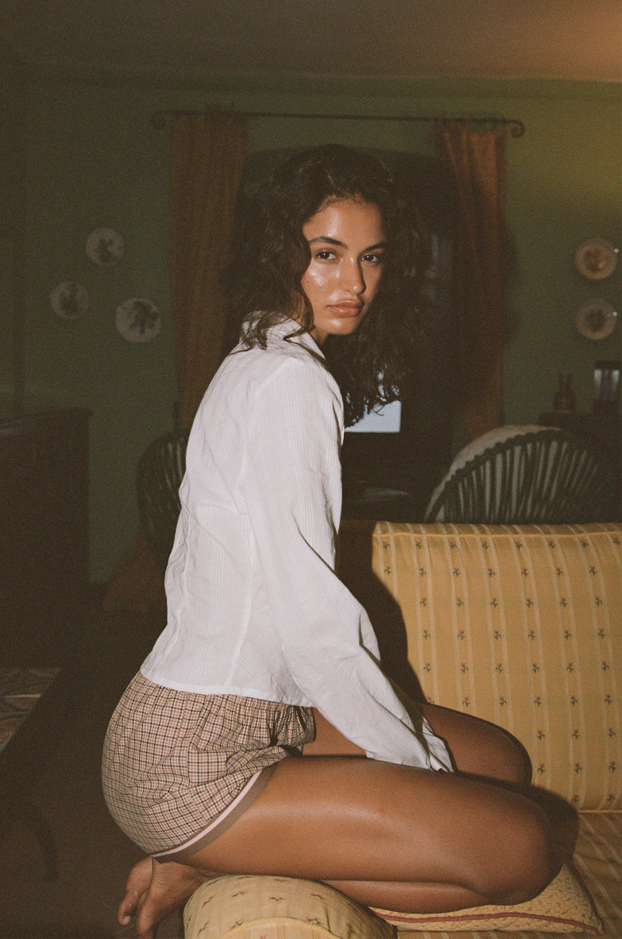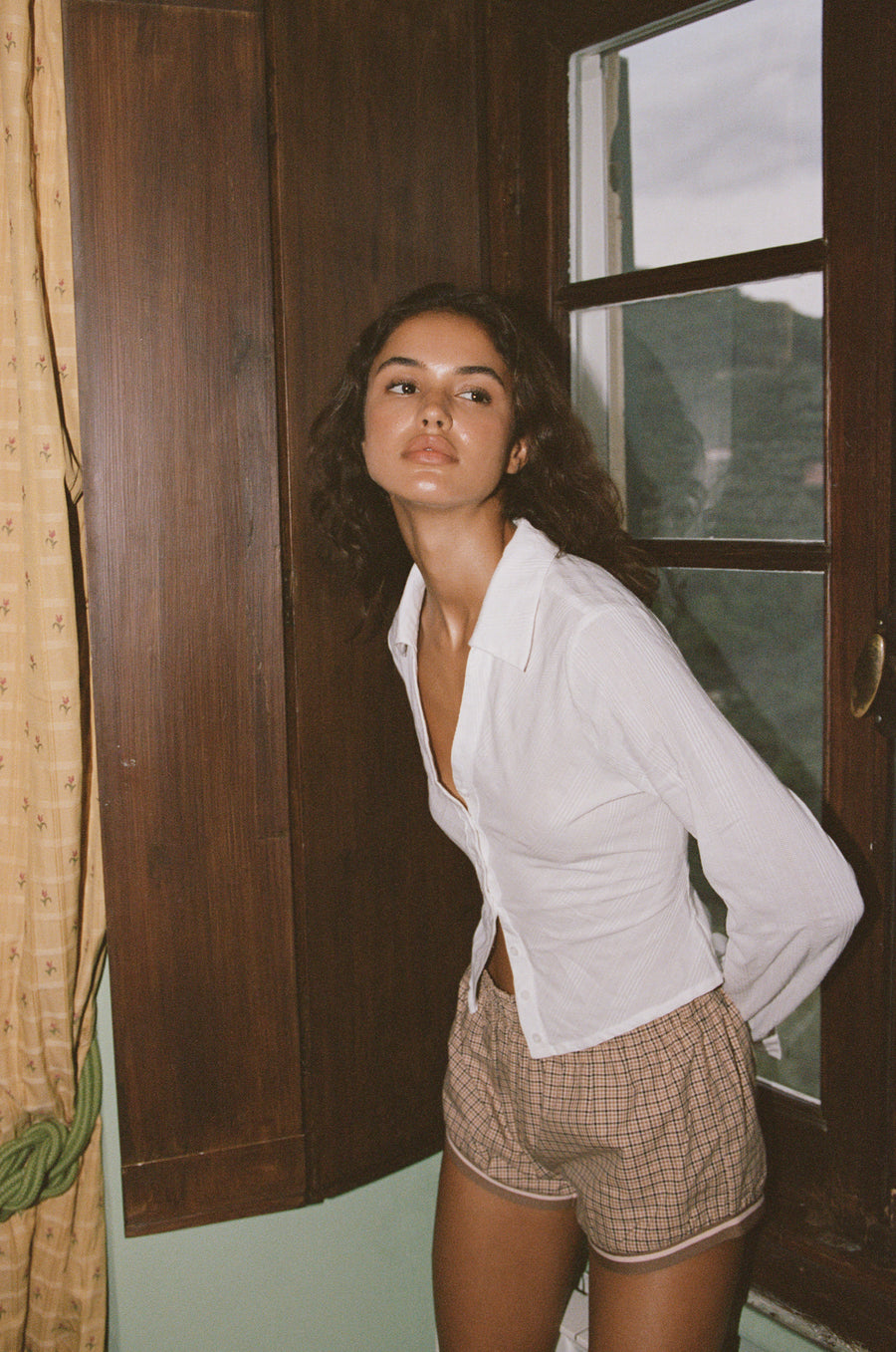 The Lyla Shirt is a long sleeve shirt, featuring a collared neckline and button down front closure.