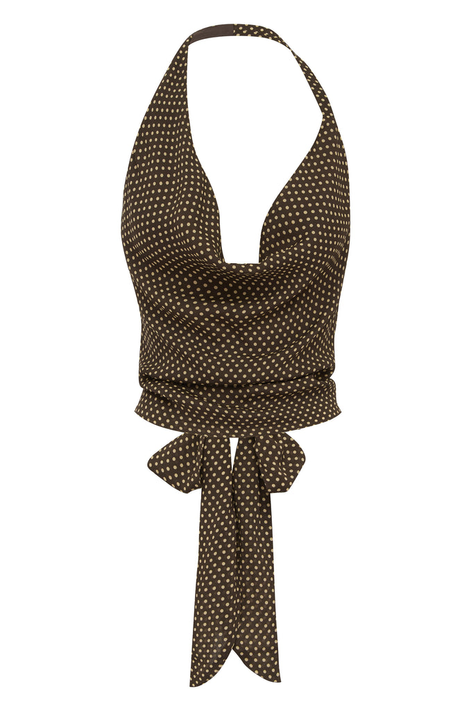 The Casper Top is a halter-style top featuring an asymmetrical cowl neck and an adjustable tie back.