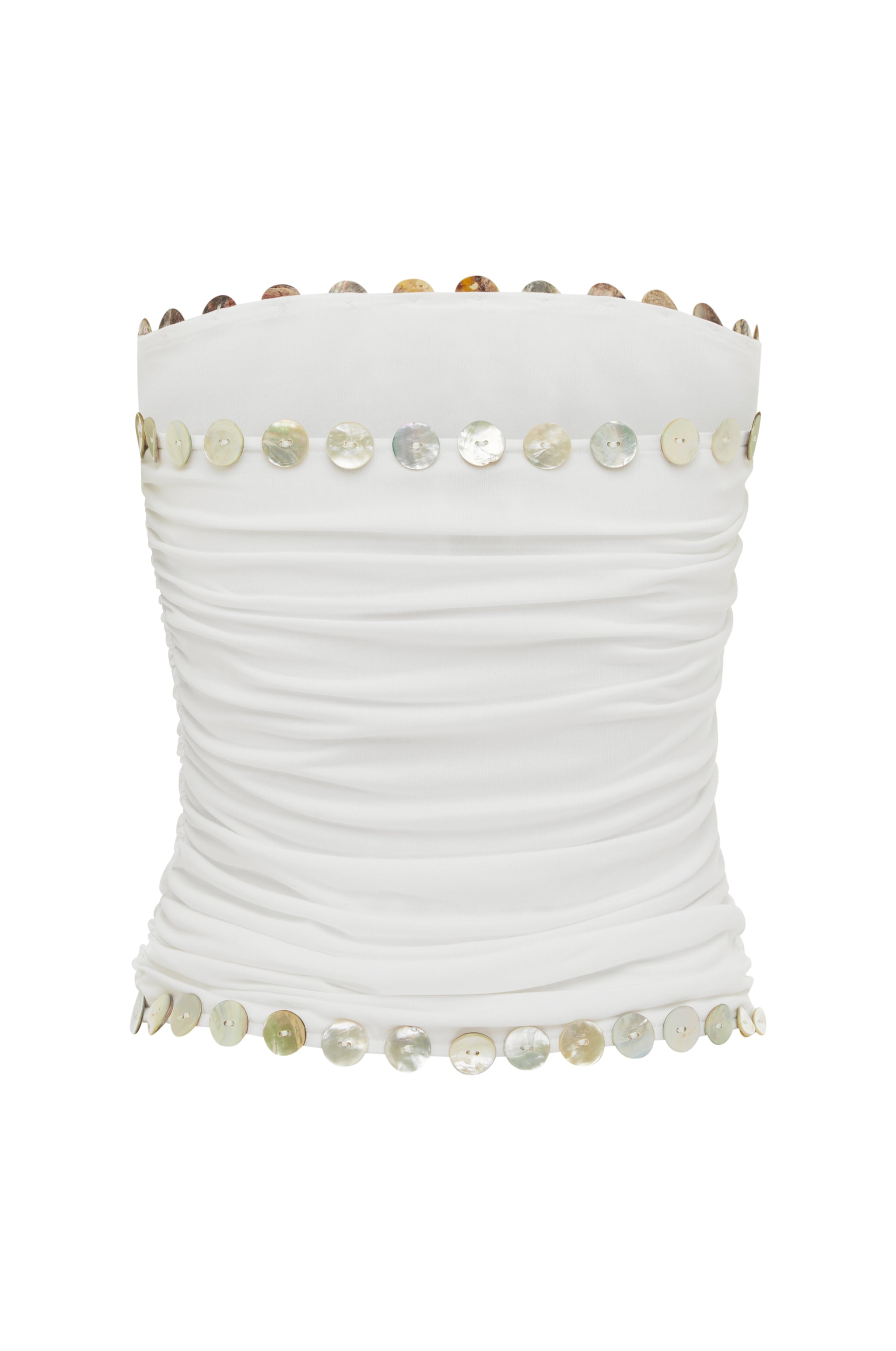 The Sonny Top is a strapless top, featuring shell button detailing at the neckline and hem and ruched gathering at the side seam.