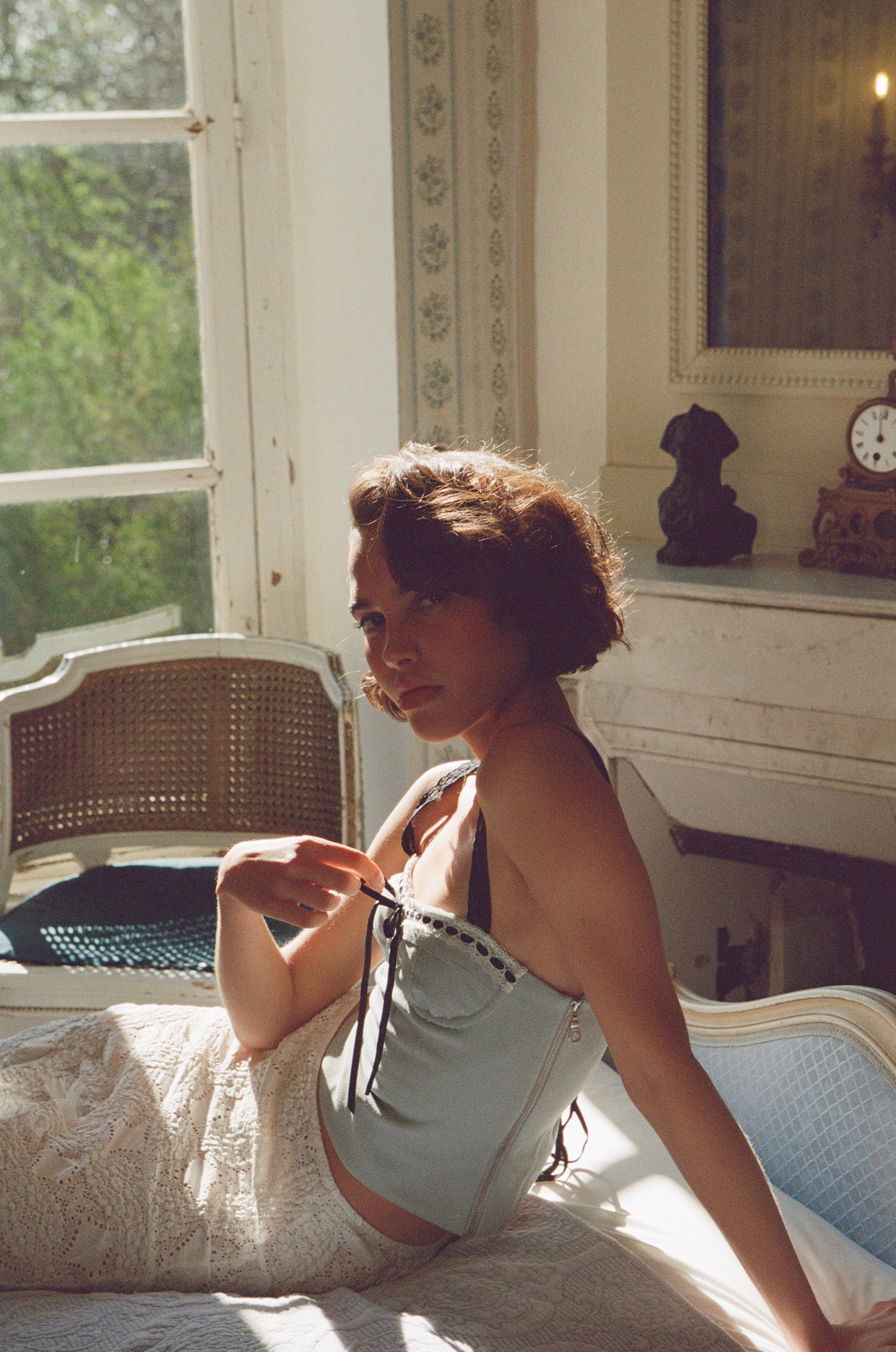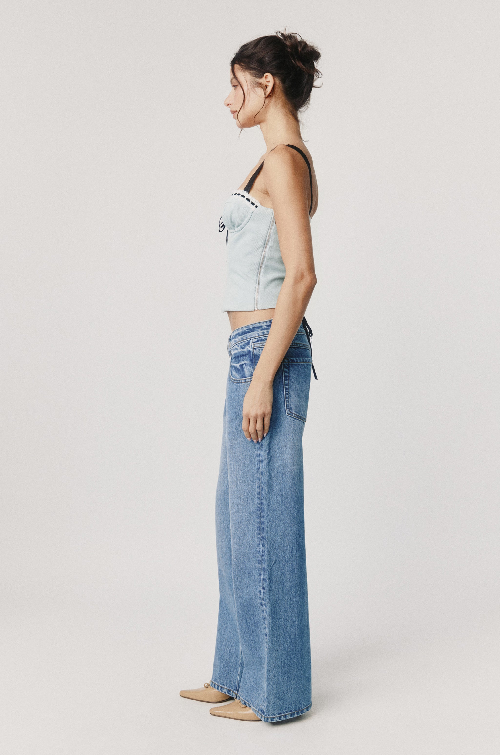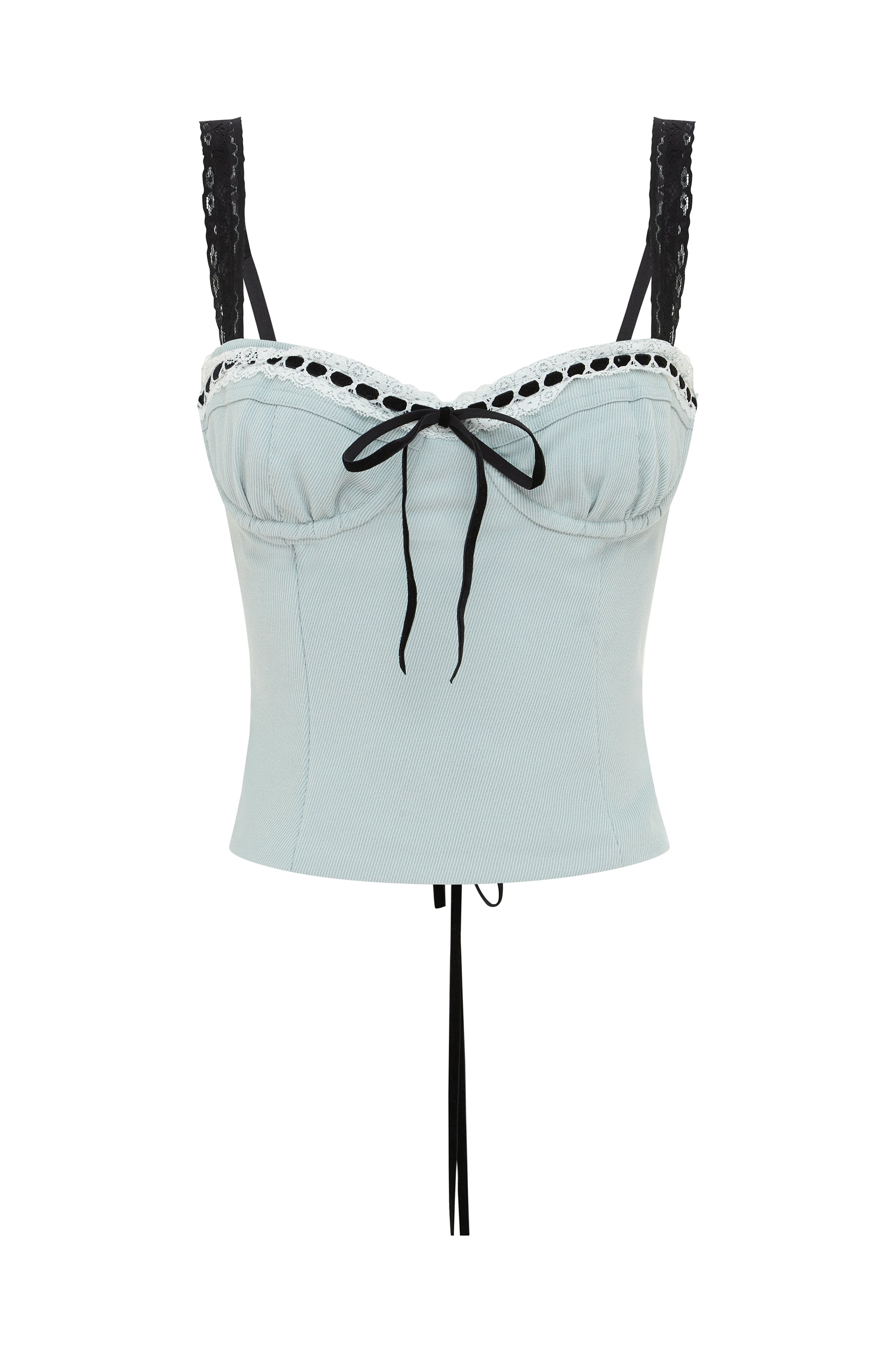 The Ryder Top is a sweetheart corset style top with a wired bust cup featuring lace detail, and a lace-up ribbon back.