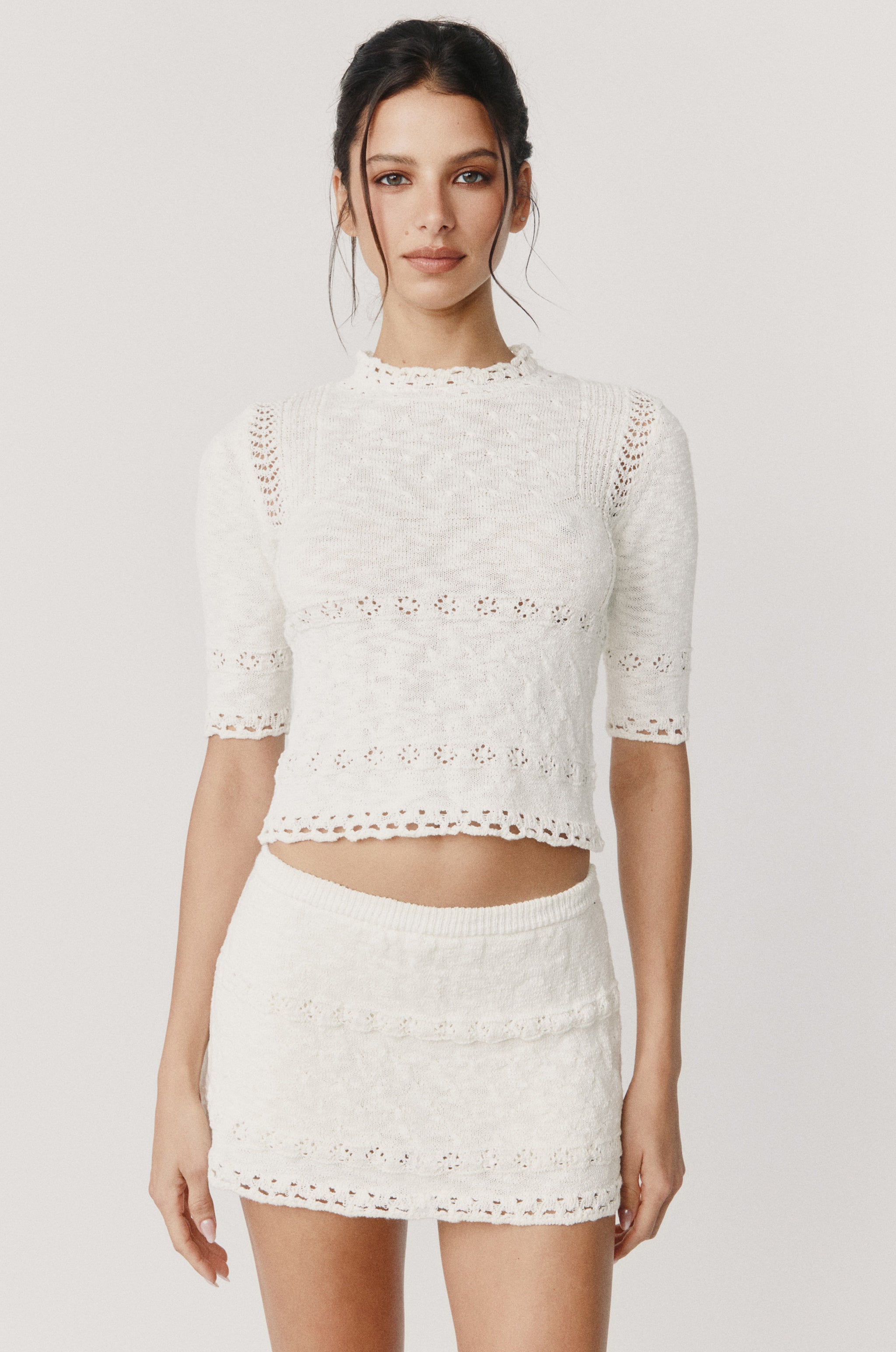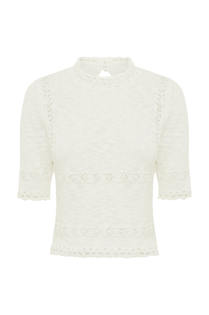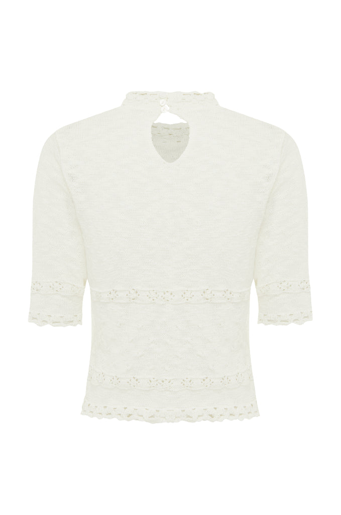 The Sev Top is a slightly cropped knitted top with a mock neck, crochet detailing, half sleeves and a three-button keyhole closure at the back neckline.