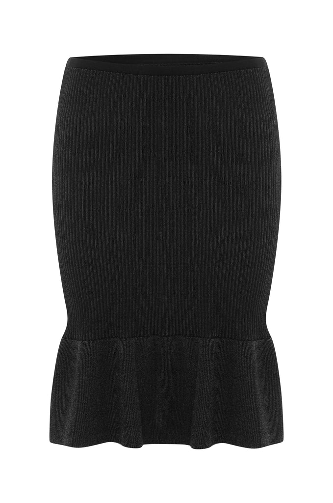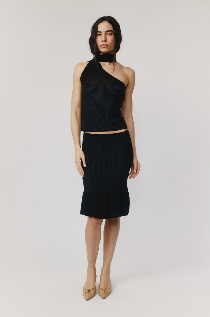 The Larissa Skirt is a ribbed knit skirt designed to be worn low on the hips, featuring a flared hem and a fitted silhouette.
