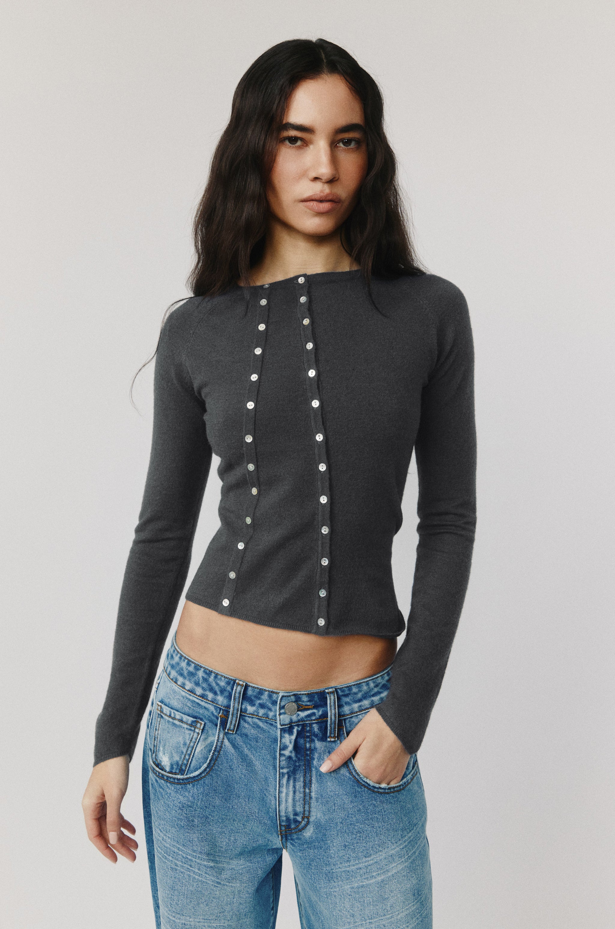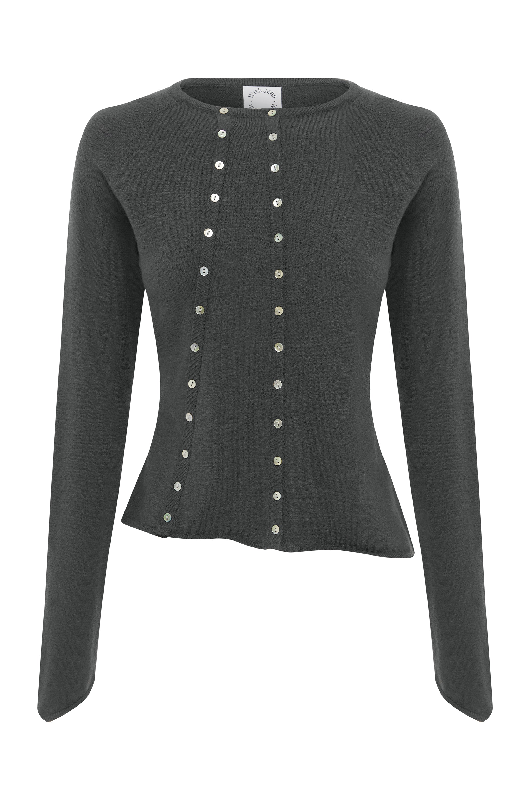 The Demi Top is a long sleeve knitted top with shell button detailing and an asymmetrical hem.
