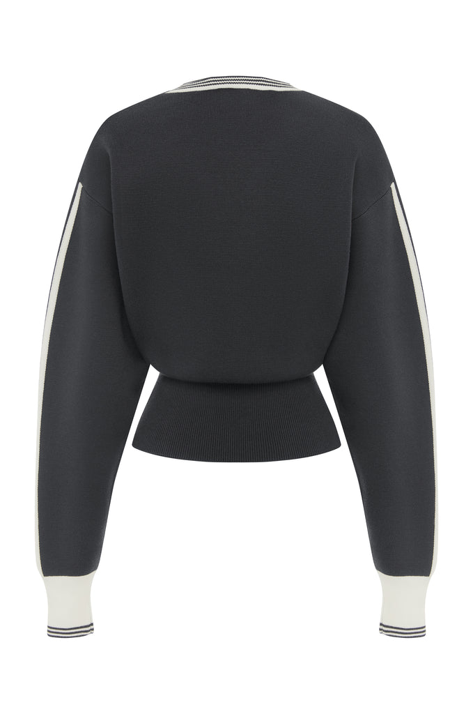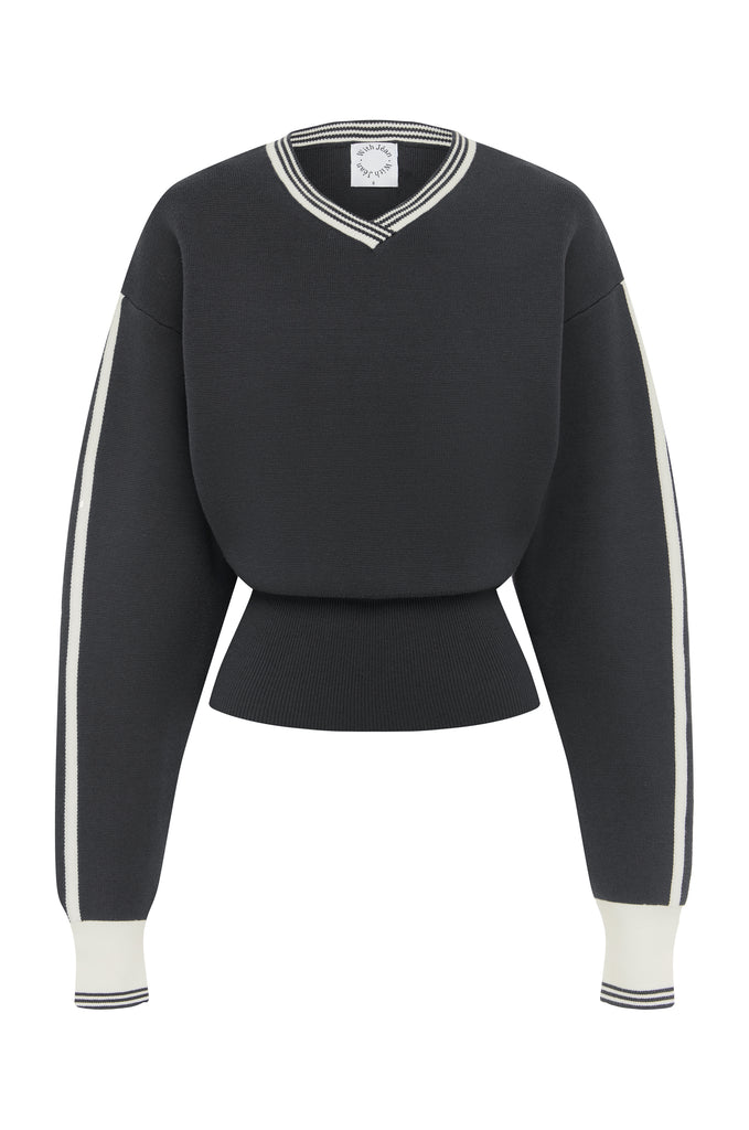 The Jacob Sweater is a knitted sweater with a contrast V-neck and stripe detailing down the sleeves. Featuring an oversized fit through the bust and sleeves, and a fitted ribbed waist. Finished with contrast ribbed cuffs and hem.
