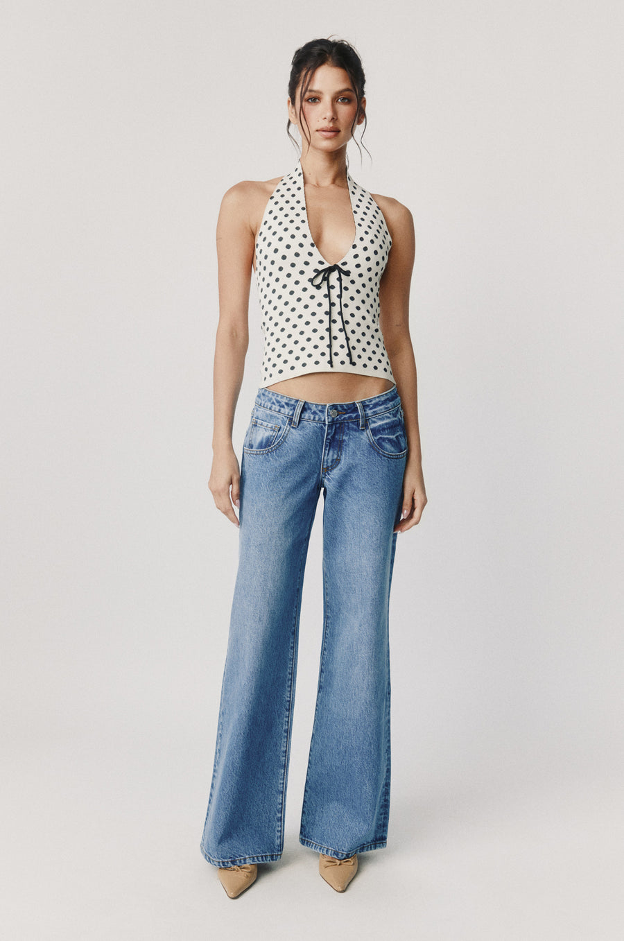 The Rendezvous Top is a halter-style, wrap top featuring a V-neckline with adjustable ties at the neck and back.