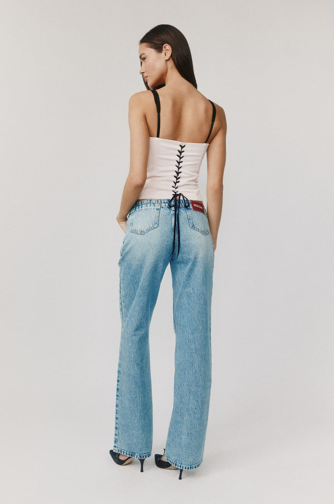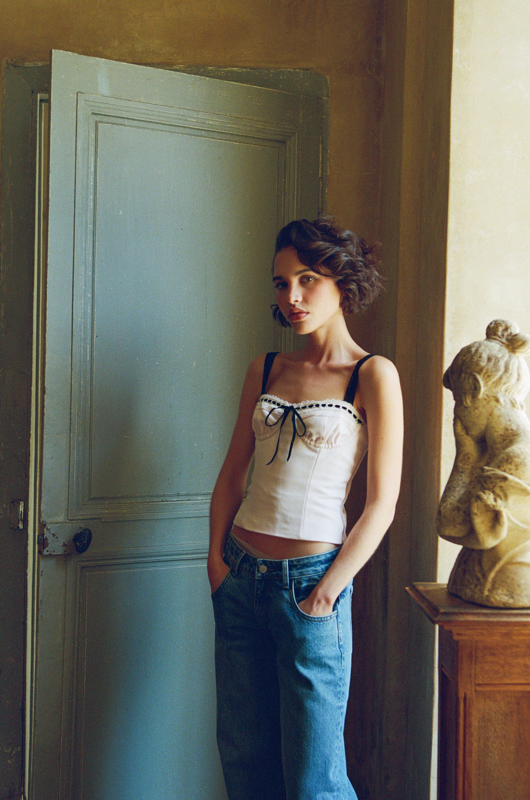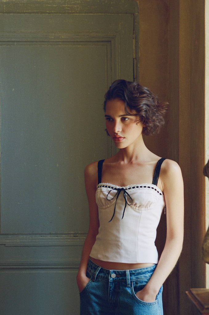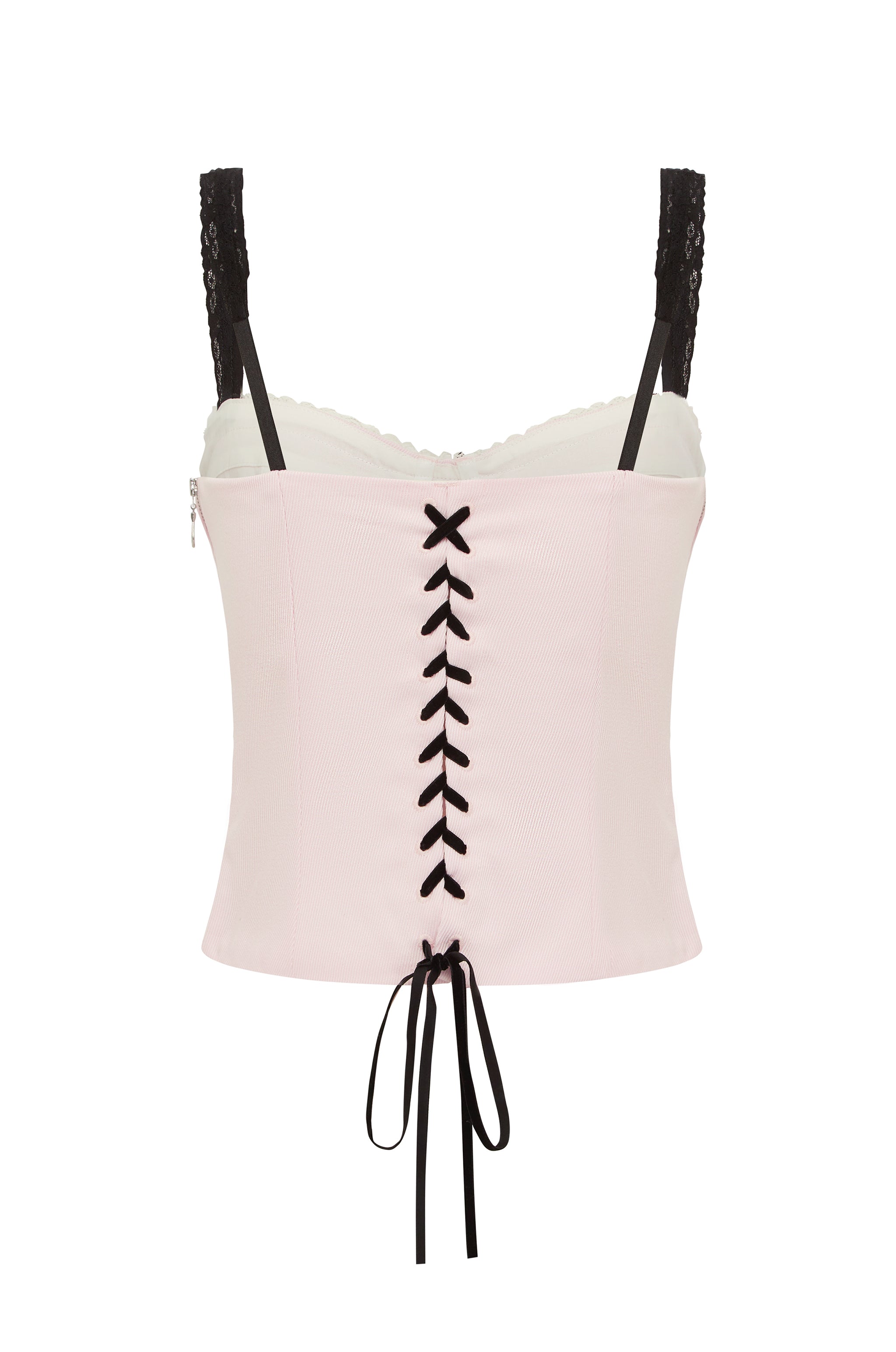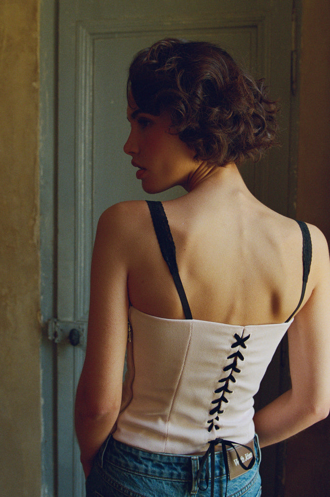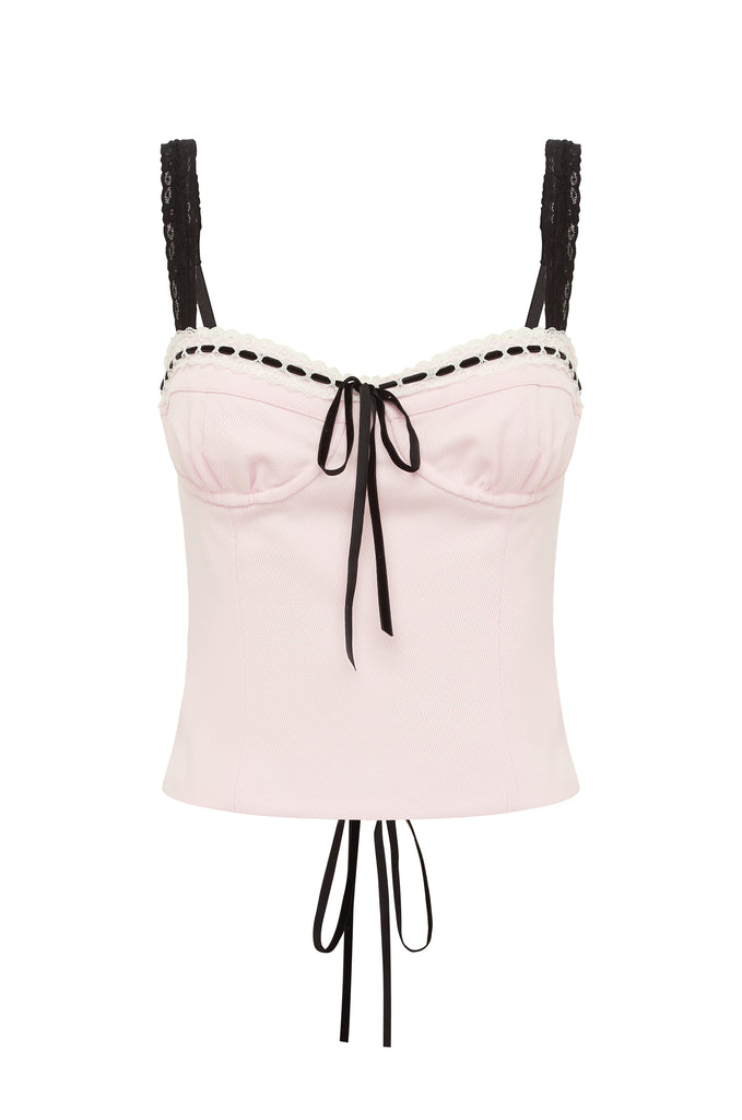 The Ryder Top is a sweetheart corset style top with a wired bust cup featuring lace detail, and a lace-up ribbon back.