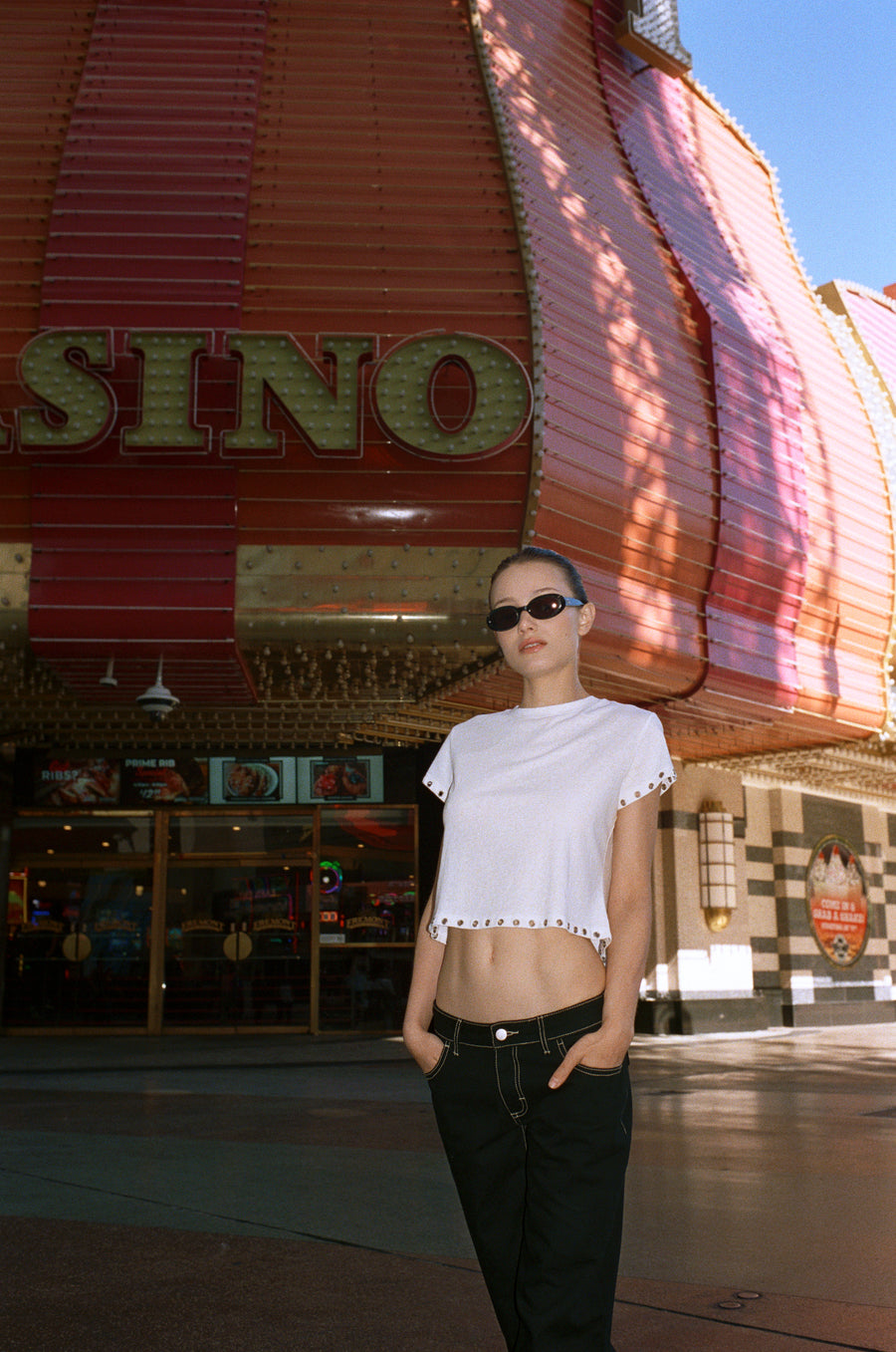 The Leah Jeans are low-rise jeans featuring contrast stitching, a custom button, front zip closure, belt loops, and front pockets.