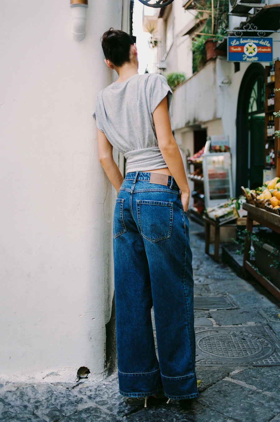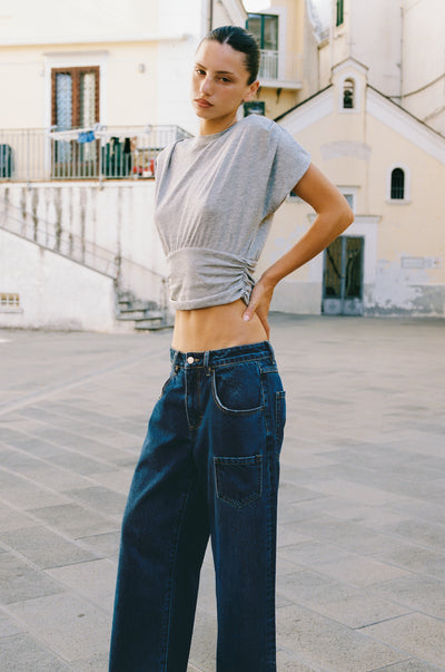 The Claudia Jeans are low-rise jeans featuring front and back pockets, belt loops, a front zip closure, and a custom button.