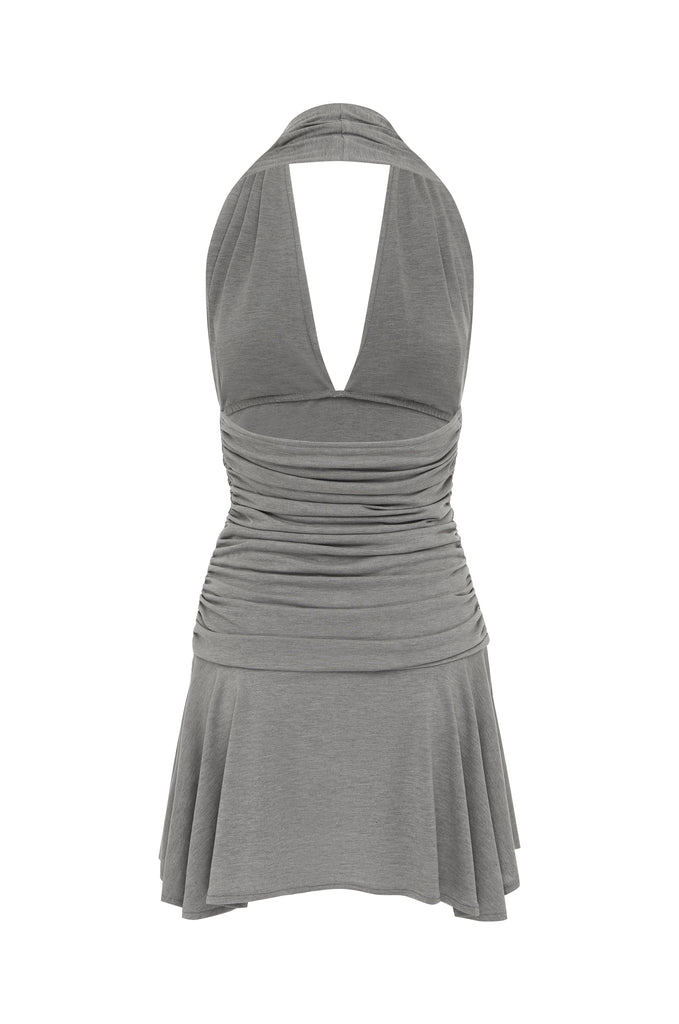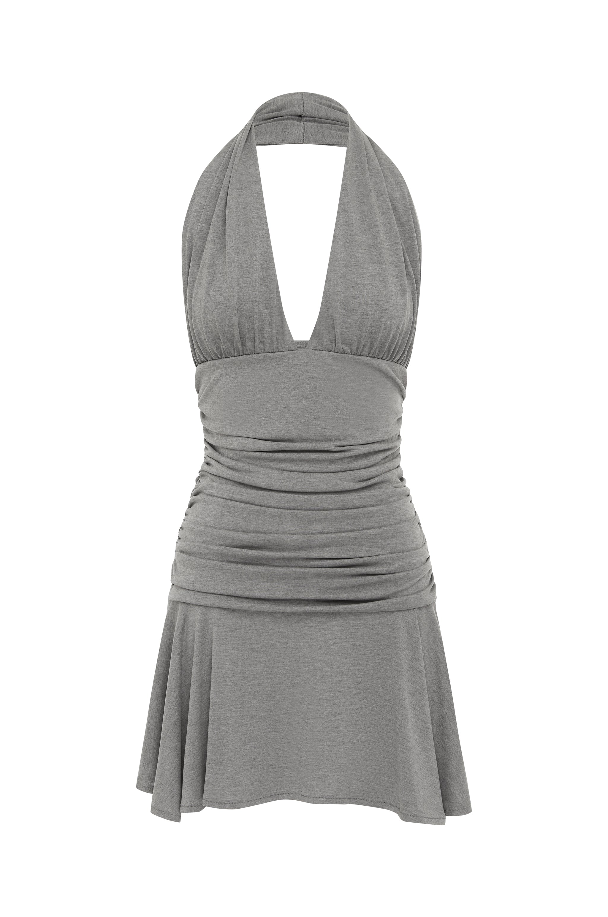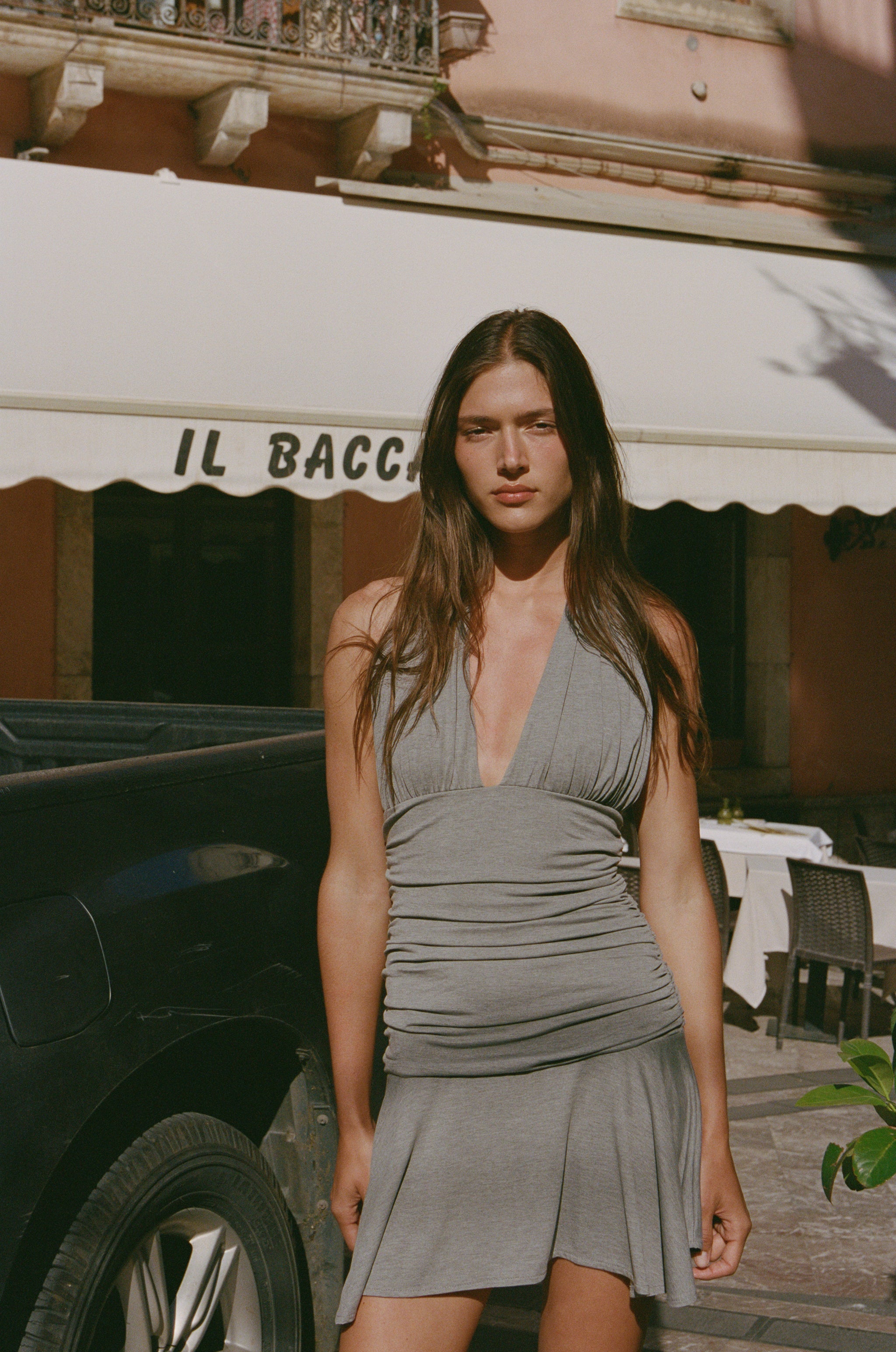 The Astoria Dress is a slim fit, midi-length dress featuring a halter neckline and ruched gathering at the side seam.