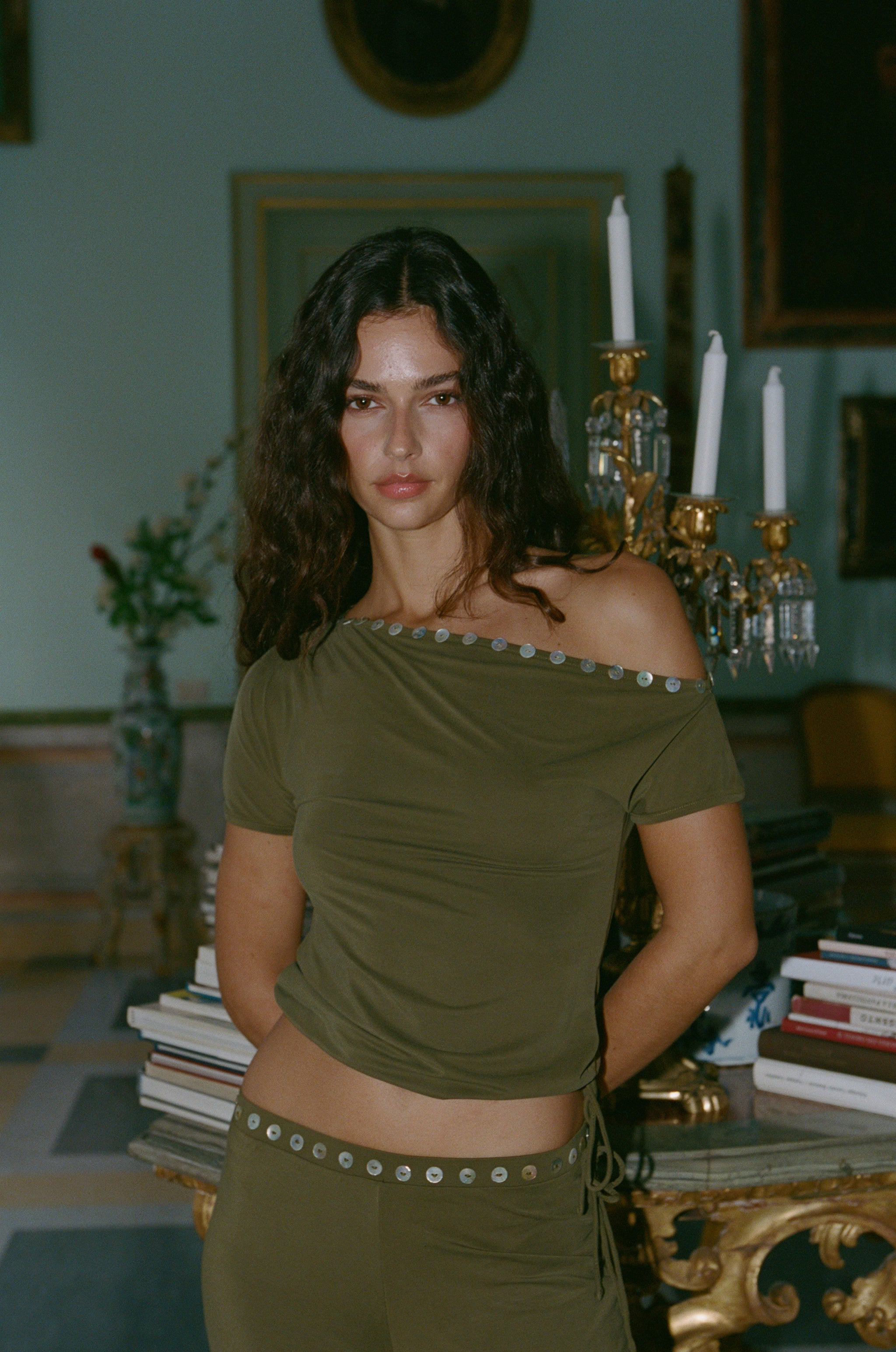 The Benny Top is an off-the-shoulder, short-sleeved top featuring shell button detailing at the neckline and an adjustable tie hem.
