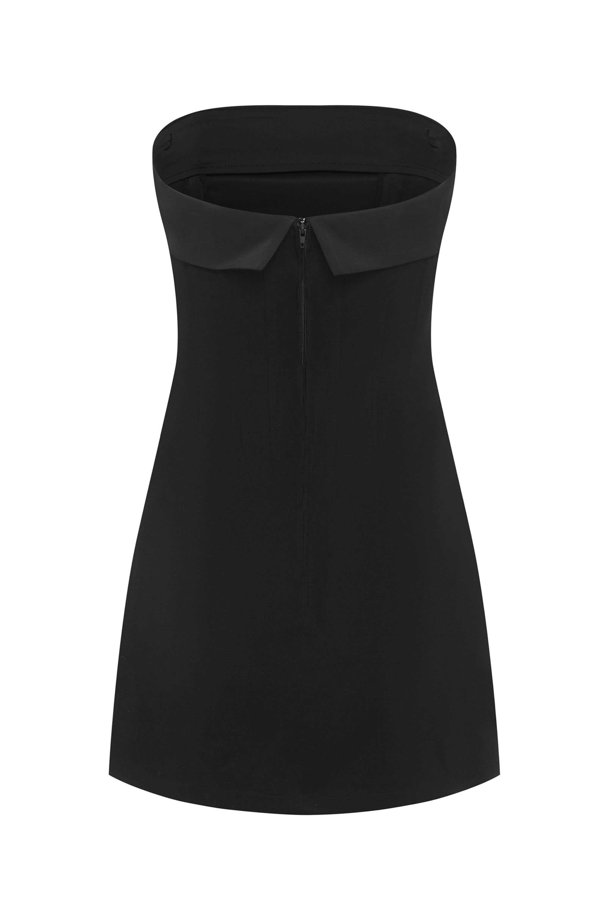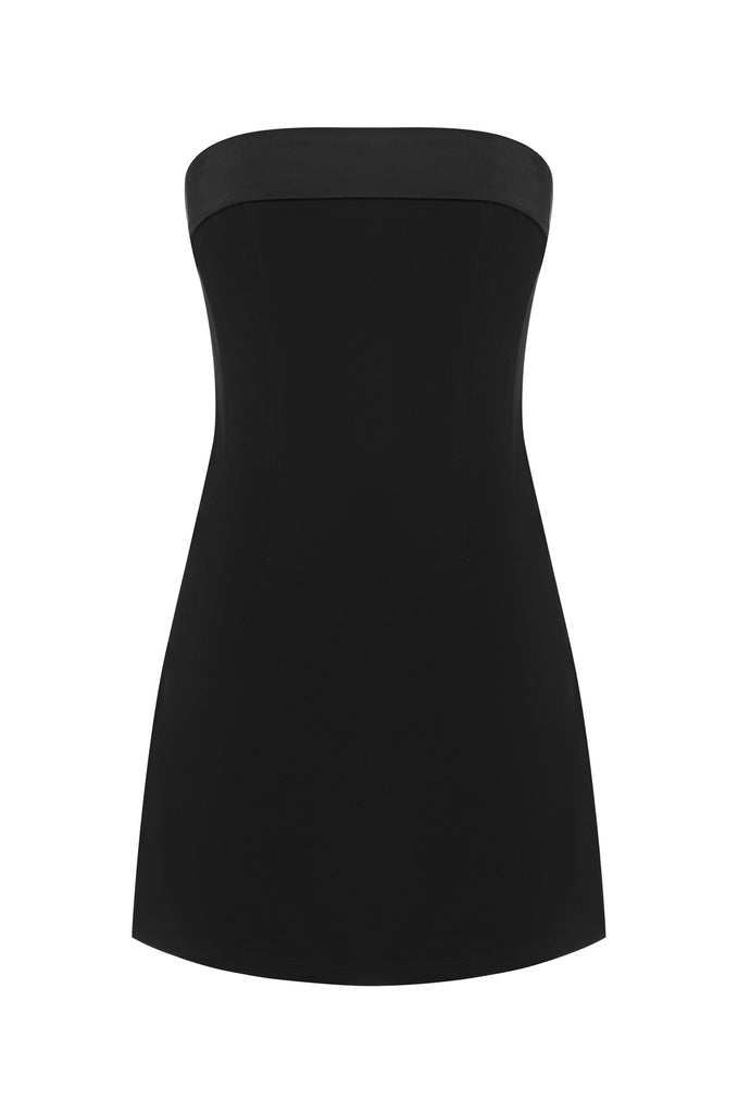 The Chloe Dress is a strapless, corset-style mini dress featuring a fold-over neckline.