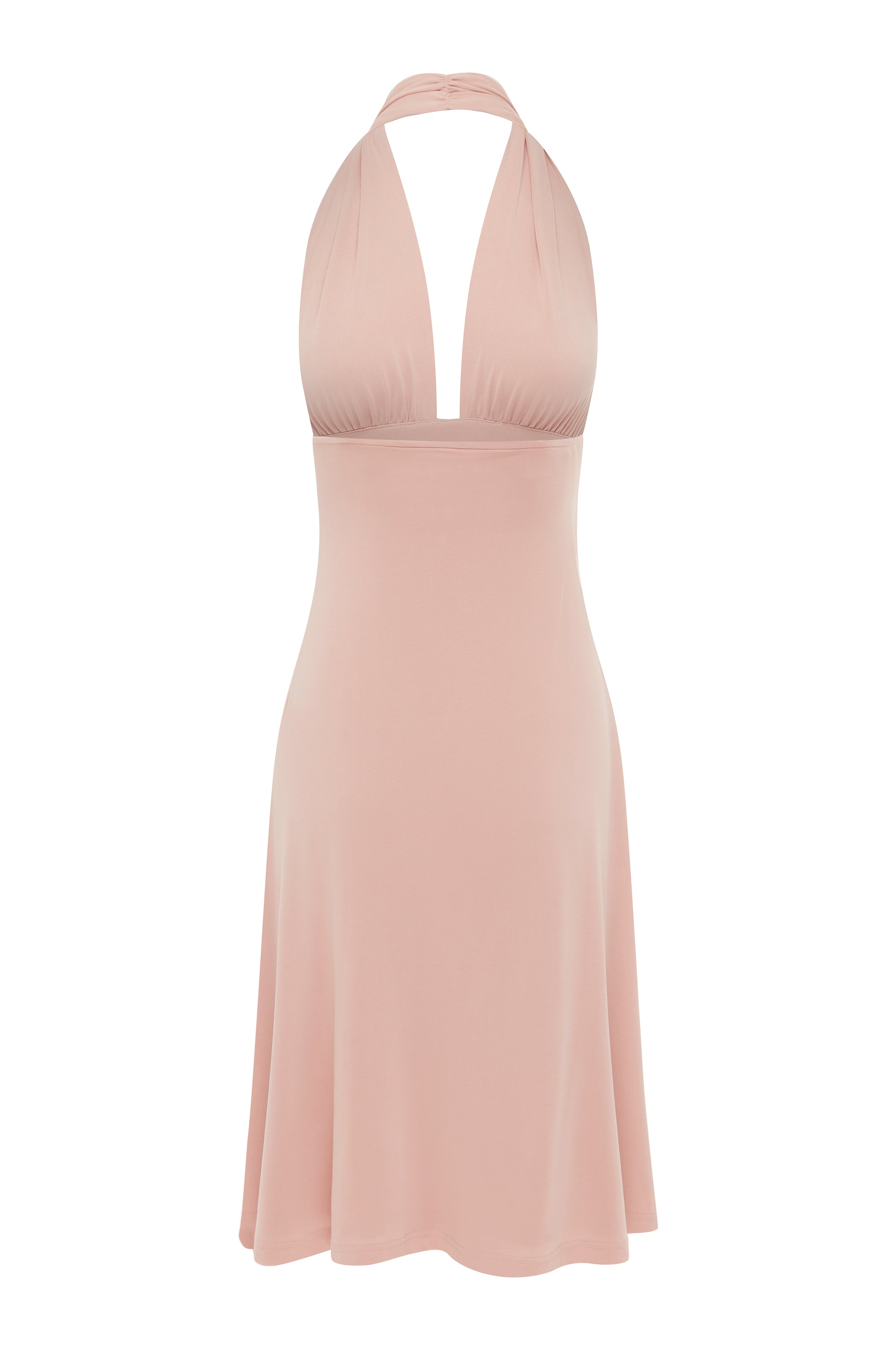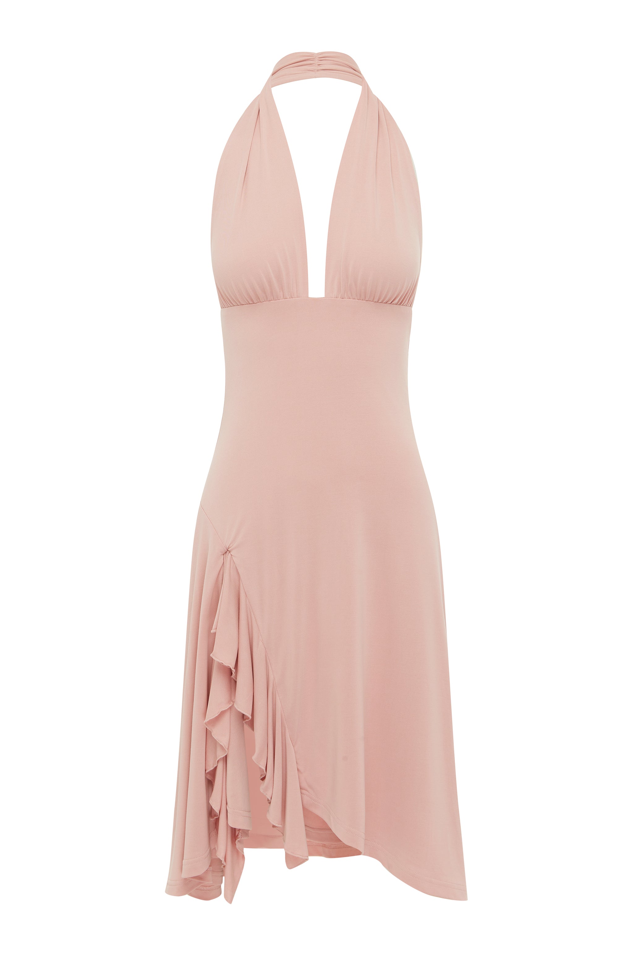 The Kesha Dress is a midi-length halter neck dress featuring a side slit with ruffle detailing.
