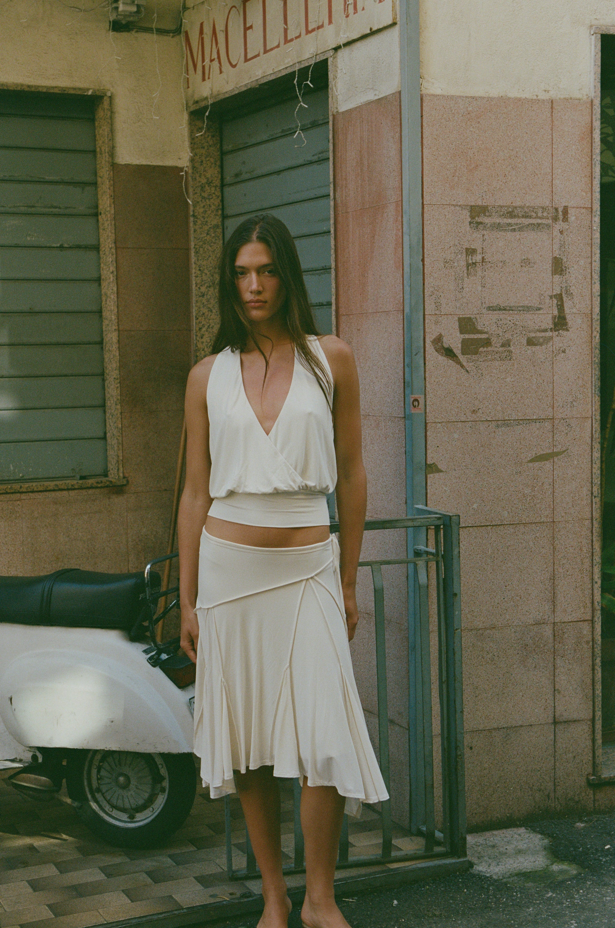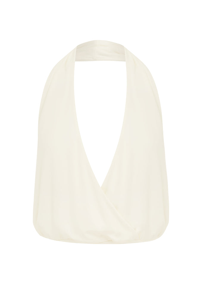 The Sharni Top is a halter-style, wrap top featuring a V-neckline and fitted band at the hem.