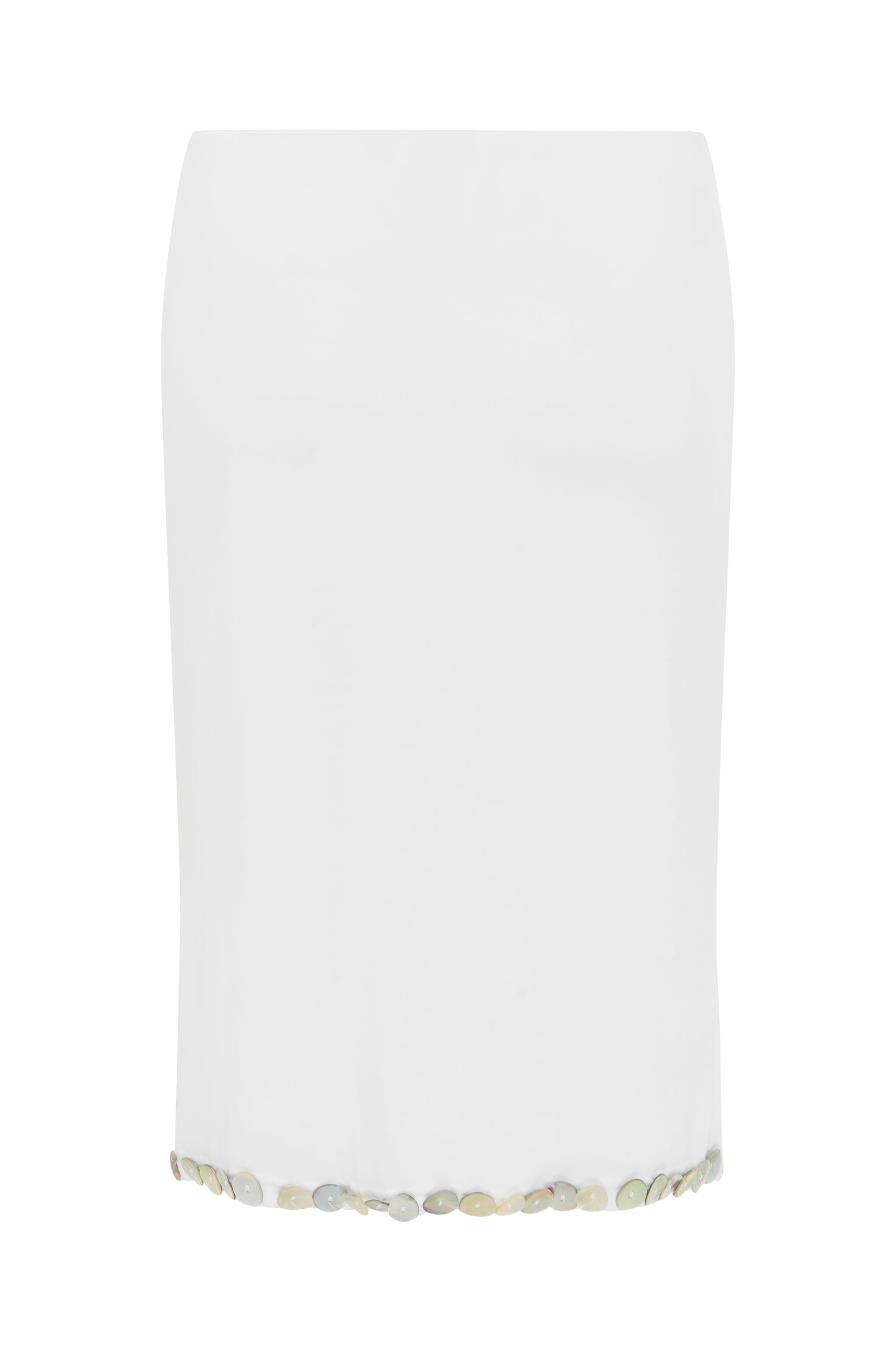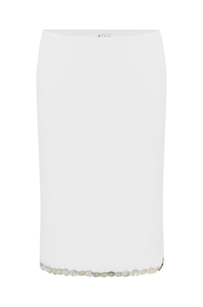 The Sonny Midi Skirt is a low rise midi-length skirt designed to be worn low on the hips featuring shell button detailing at the hem.