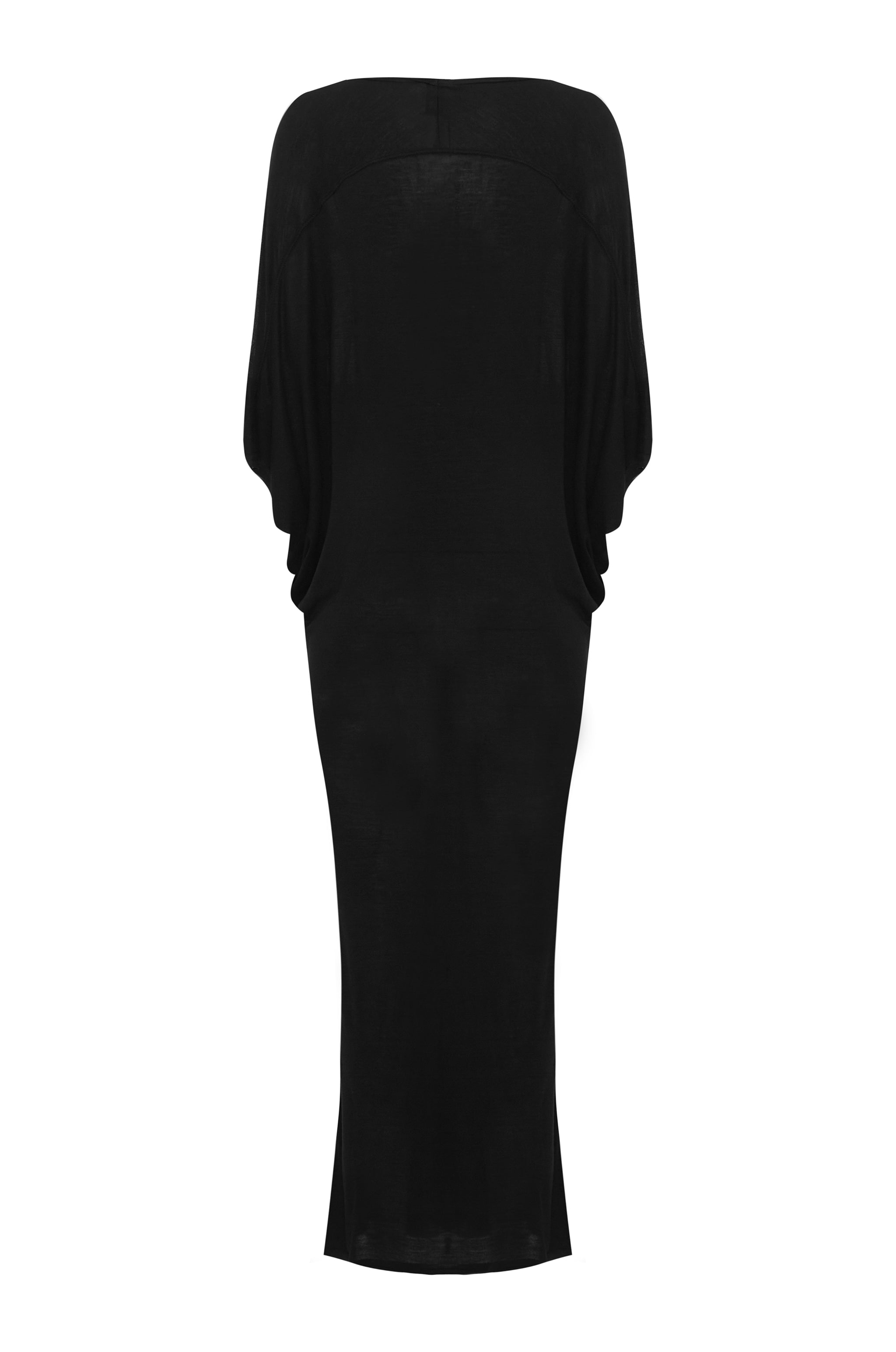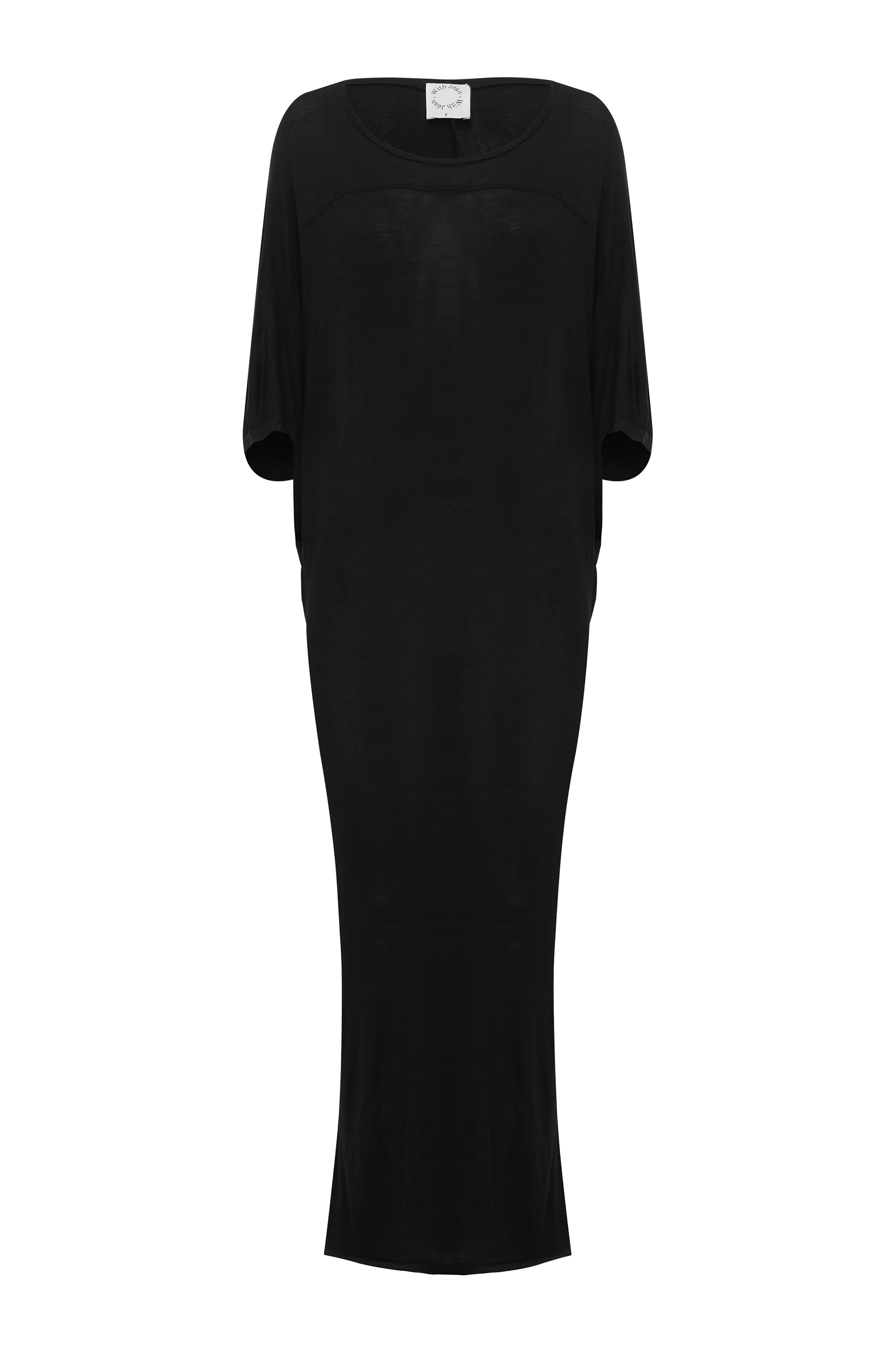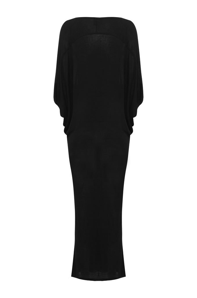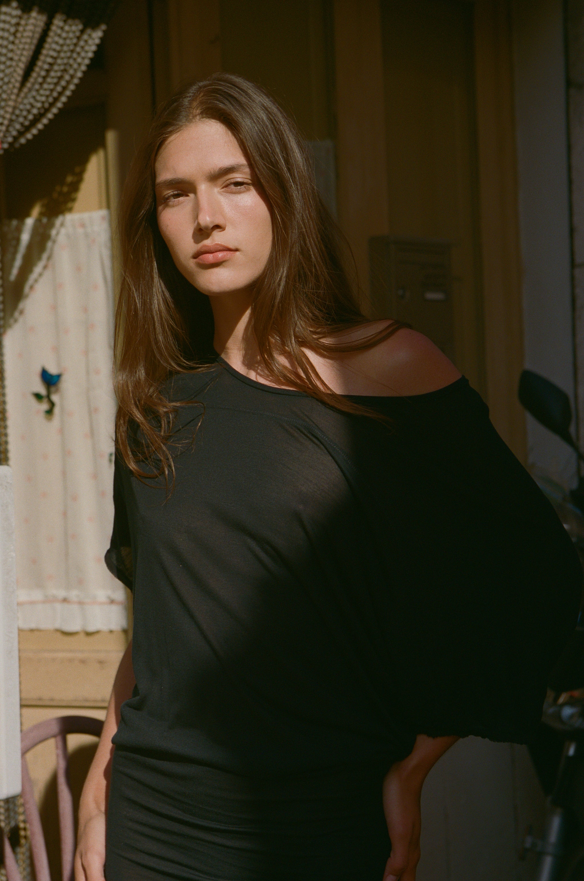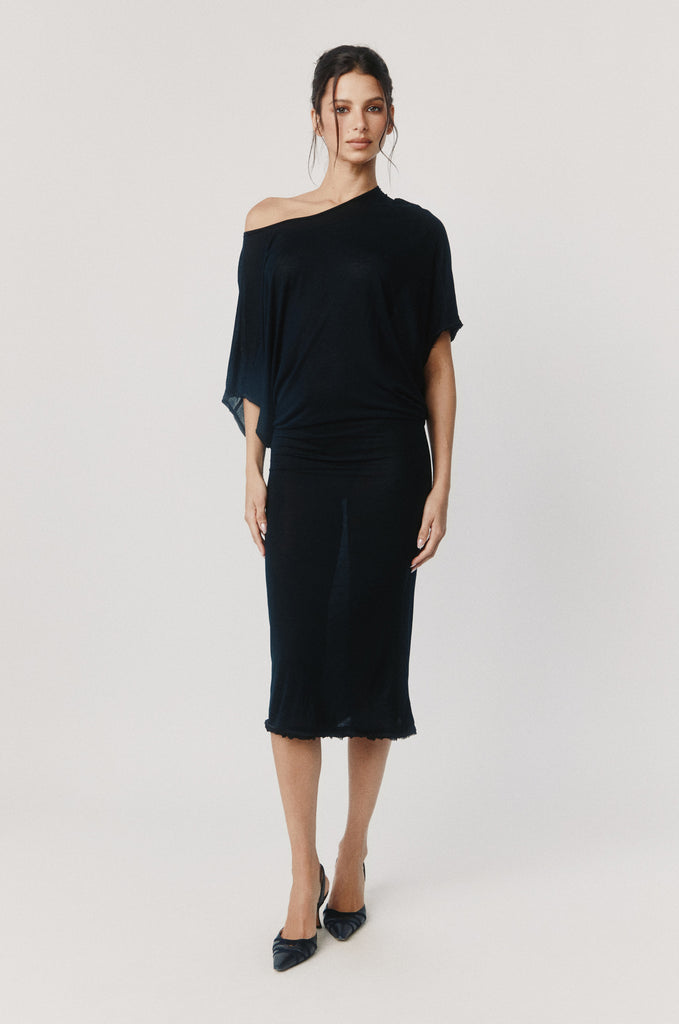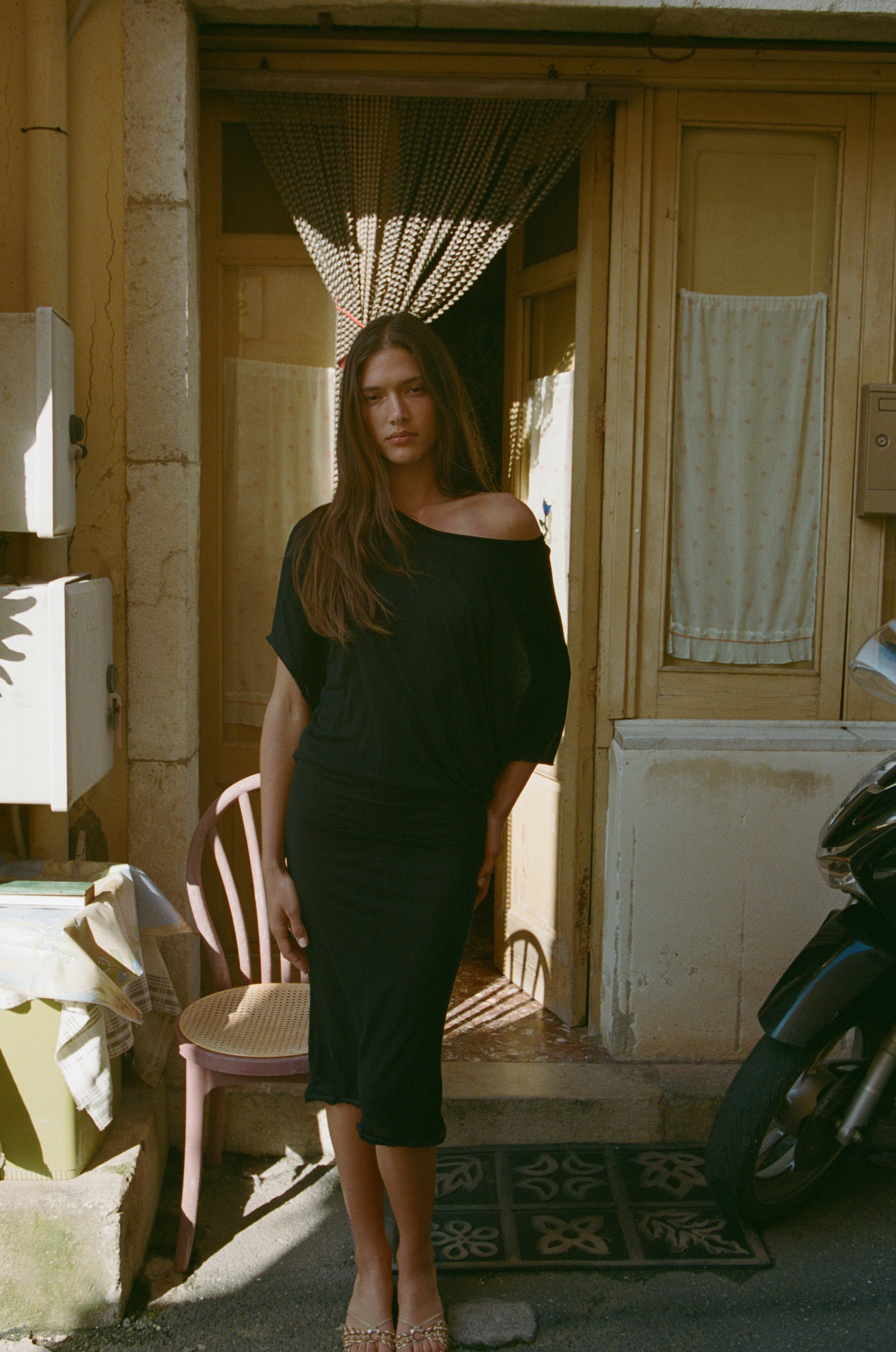 The Vinnie Dress is an off-the-shoulder, midi-length dress featuring a relaxed neckline, fitted body, and raw edge hem.