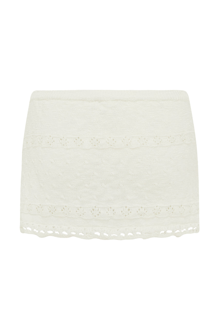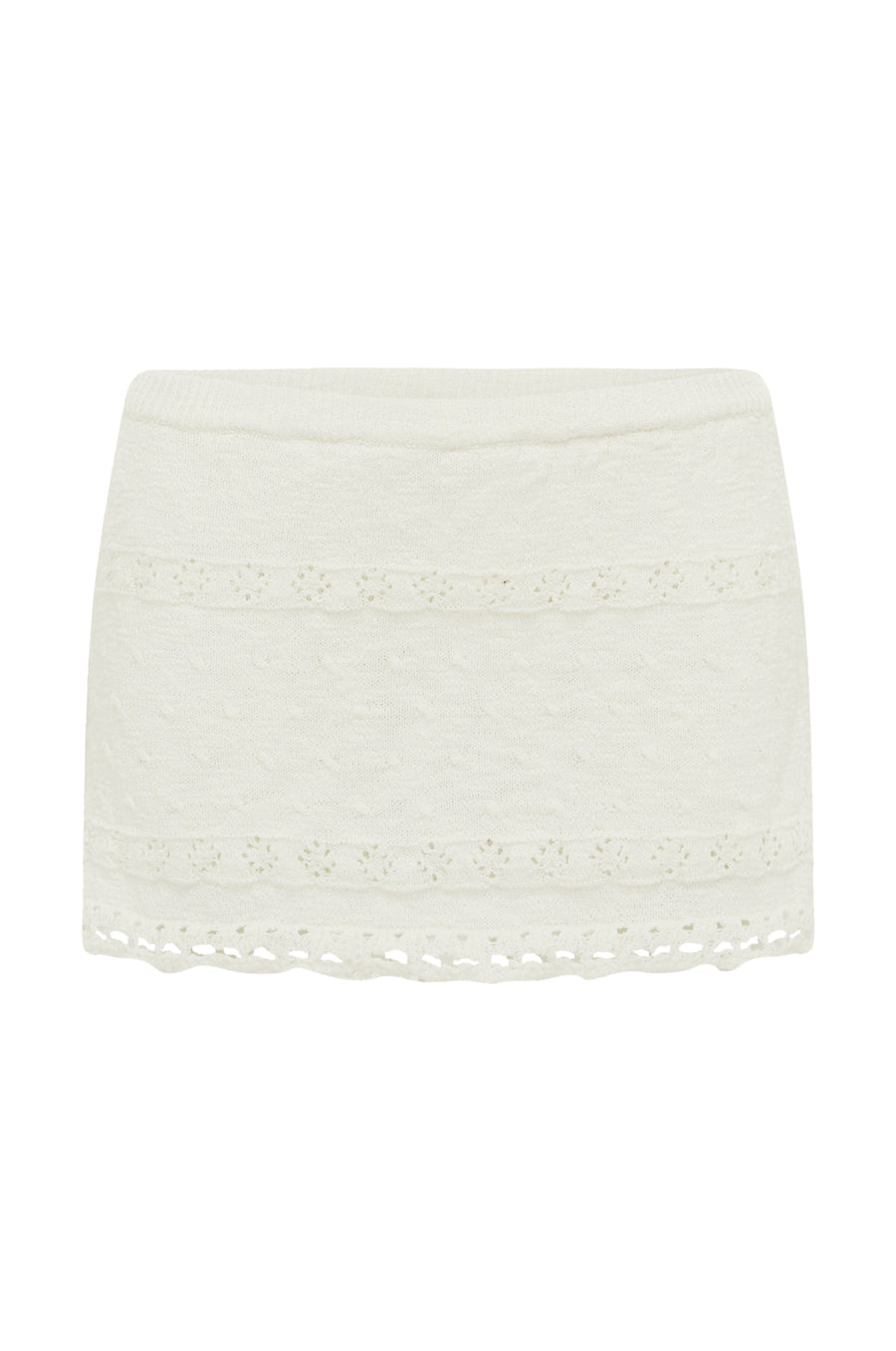 The Sev Top is a slightly cropped knitted top with a mock neck, crochet detailing, half sleeves and a three-button keyhole closure at the back neckline.