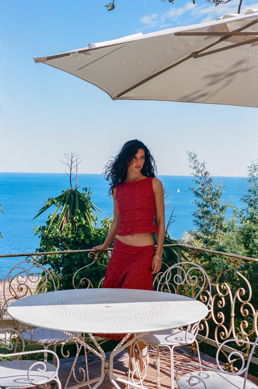 The Maeve Midi Skirt is a low rise, midi length skirt designed to be worn low on the hips featuring custom embroidery detailing throughout.